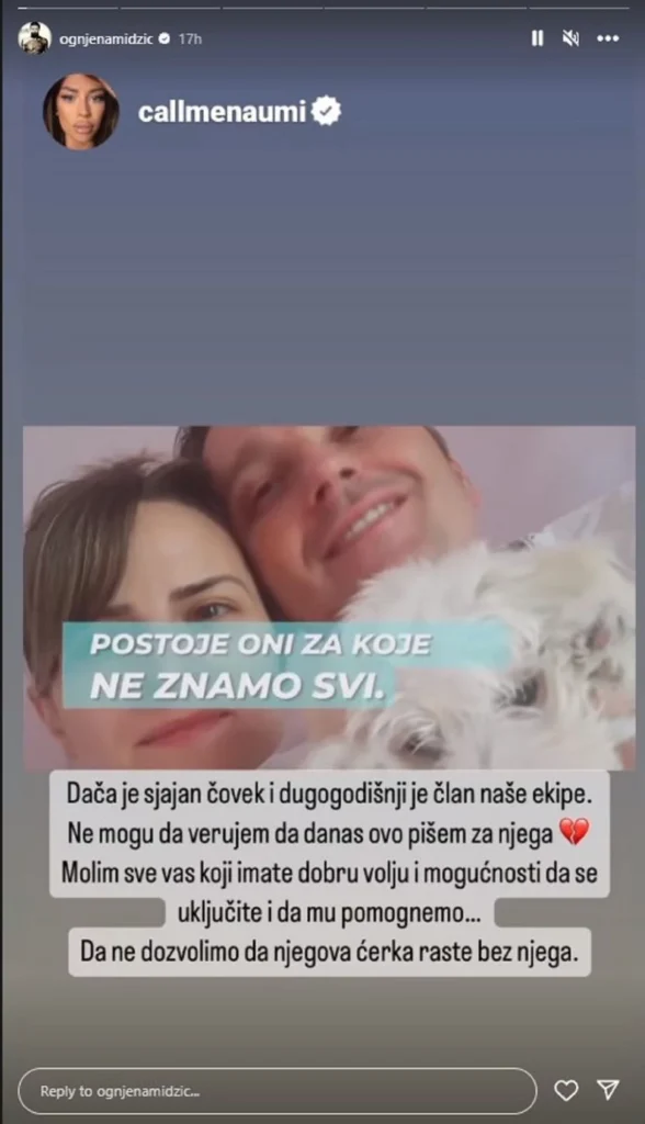 – Dača je sjajan čovek i dugogodišnji je član naše ekipe. Ne mogu da verujem da danas ovo pišem za njega. Molim sve vas koji imate dobru volju i mogućnosti da se uključite i da mu pomognemo. Da ne dozvolimo da njegova ćerka raste bez njega – napisala je Mina.