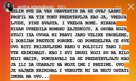 – Želim sve da vas obavestim da se ovaj lažni profil na TikToku predstavlja kao ja, vređa ljude, piše svašta i vređa Rome. Nikada nisam uvredila romsku zajednicu, a osoba koja stoji iza ovoga mi pravi jako velike probleme i dobijam preteće poruke – napisala je Anita i dodala: