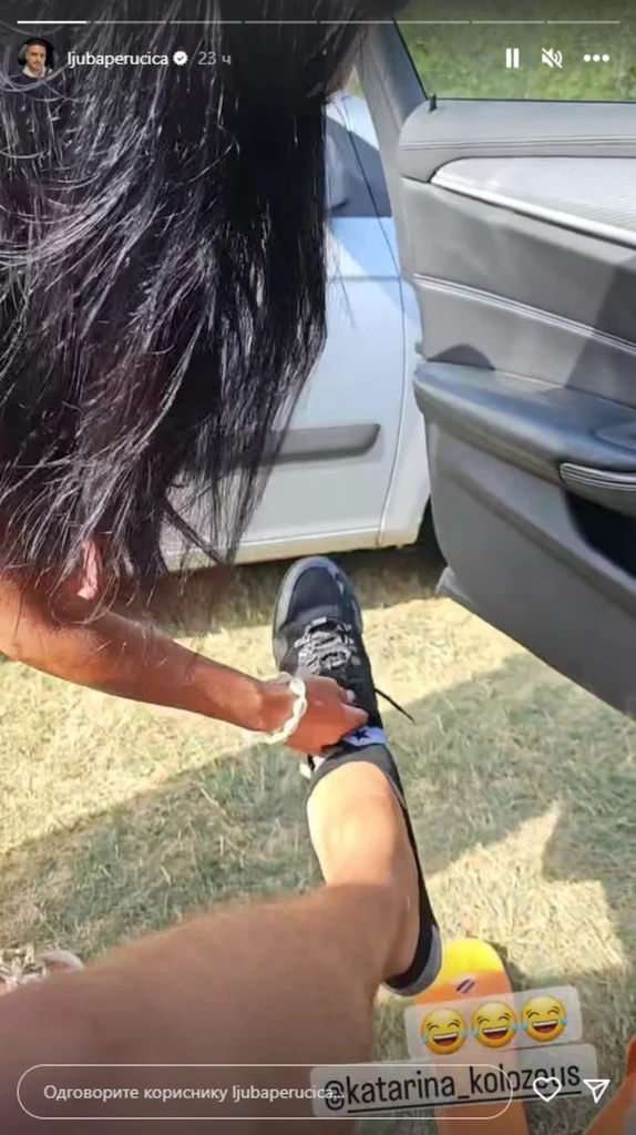 Na videu je pevač pokazao kako sedi u kolima dok mu Katarina briše noge od peska i obuva mu čarape, a zatim i patike.