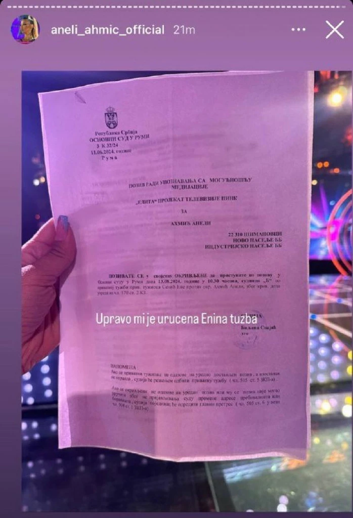 Drugoplasirana takmičarka „Elite 7“ Aneli Ahmić sinoć je bila gošća voditeljke Dušice Jakovljević u emisiji „Narod pita“, nakon čega je stigla na superfinalnu žurku. Aneli se oglasila putem storija na društvenoj mreži Instagram, te otkrila da joj je uručena tužba, koju je protiv nje podnela Ena Senić, bivša supruga Marka Janjuševića Janjuša.