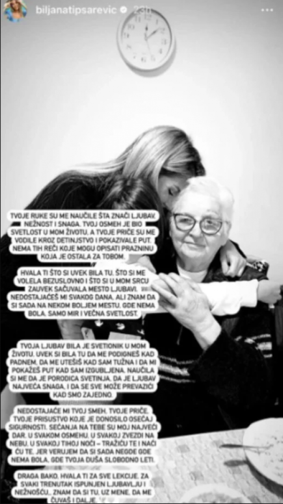 Biljana Tipsarević, supruga tenisera Janka Tipsarevića, nedavno je na svom Instagram profilu podelila dirljivu poruku posvećenu svojoj baki koja je nedavno preminula. Uz zajedničku fotografiju, Biljana je izrazila svoju tugu i zahvalnost prema voljenoj baki, ističući njenu neizmernu ljubav i podršku kroz sve životne trenutke. Ova emotivna objava dirnula je mnoge njene pratioce na društvenim mrežama.