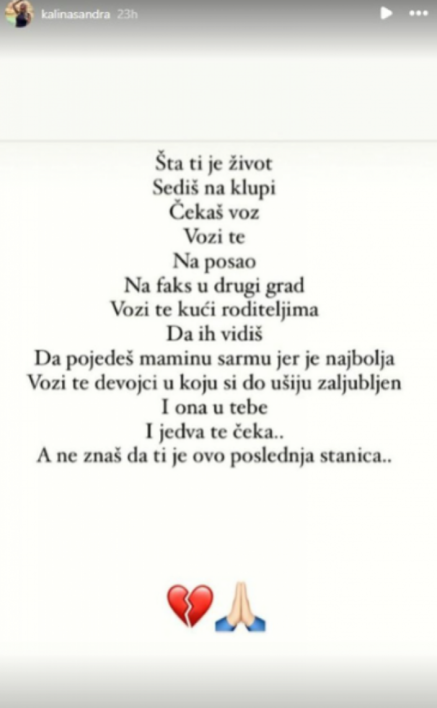 Sandra Kalinić, navodno bivša supruga poznatog voditelja i glumca Milana Kalinića, oglasila se povodom ove tragične nesreće. Na svom Instagram profilu, Sandra je podelila emotivnu poruku u kojoj izražava tugu zbog gubitka života u ovoj strašnoj nesreći. Njene reči odaju duboku empatiju i bol zbog izgubljenih života u ovoj tragediji.