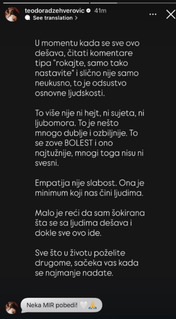 – U momentu kada se sve ovo dešava, čitati komentare tipa „rokajte, samo tako nastavite“ i slično nije samo neukusno, to je odsustvo osnovne ljudskosti. To više nije ni hejt, ni sujeta, ni ljubomora. To je nešto mnogo dublje i ozbiljnije. To se zove BOLEST i ono najtužnije, mnogi toga nisu ni svesni – počela je Teodora na Instagram storiju, pa nastavila: